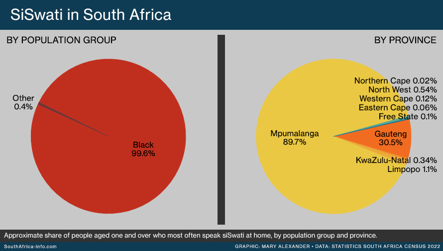 Pie charts of the siSwati language spoken in South Africa by population group and province, according to Census 2022. South Africa’s 12 official languages are Afrikaans, English, isiNdebele, isiXhosa, isiZulu, Sepedi (Sesotho sa Leboa), Sesotho, Setswana, siSwati, Tshivenda, ans South African Sign Language. Other major languages include Khoi, Nama, San, Shona, Chichewa and Portuguese.